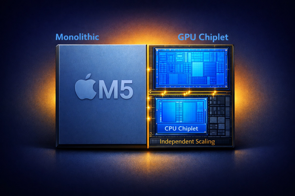 Apple Silicon delivered remarkable efficiency when the M1 launched, but the architecture carried a fundamental constraint. Everything lived on a single die. The CPU cores, GPU cores, Neural Engine, and memory controllers all shared one piece of silicon connected to unified memory.